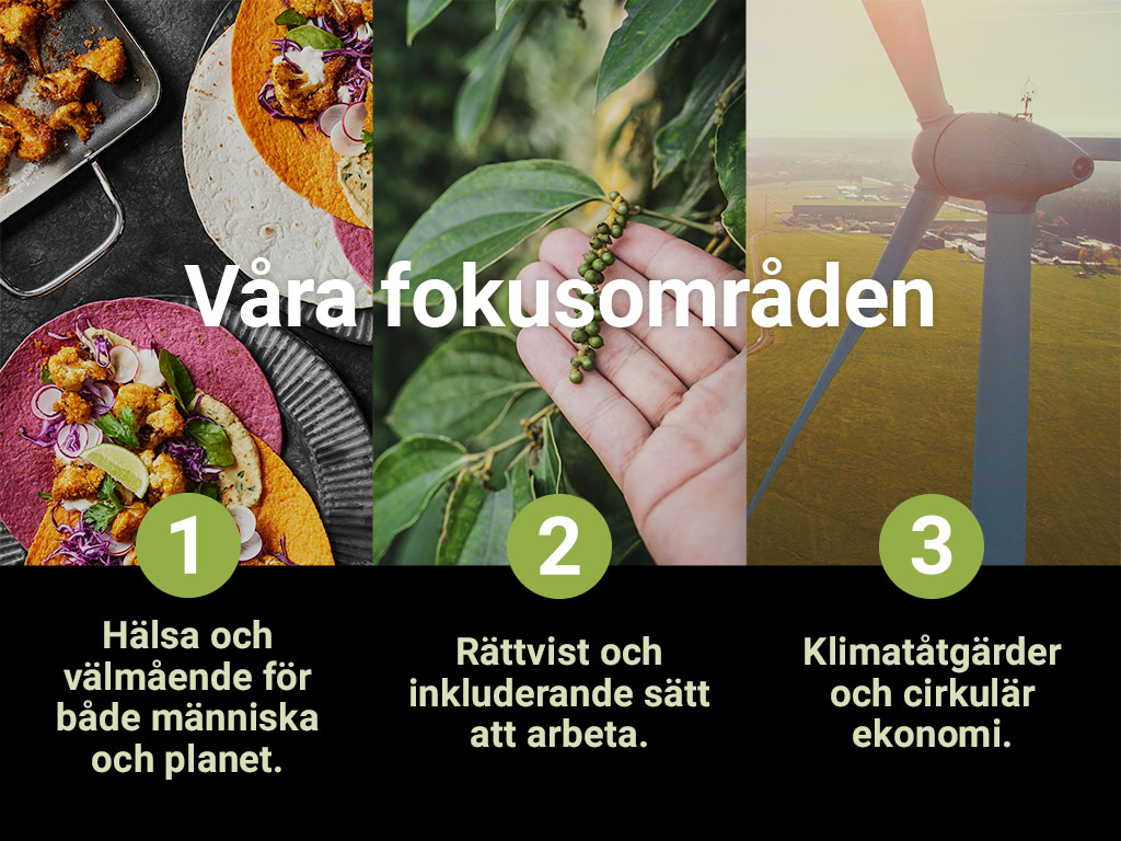 För oss finns inget alternativ – vi vill göra skillnad, bidra till en hållbar utveckling och vara en föregångare för andra i vår bransch. Det betyder att vi ständigt vill förbättra vår egen verksamhet och göra det enklare för dig att göra hållbara val som varken krånglar till det, minskar din lönsamhet eller kompromissar med smaken. Fram till 2030 fokuserar vi på tre områden som ska bidra till att nå de globala utvecklingsmålen och skapar en plats för god mat även i framtiden.