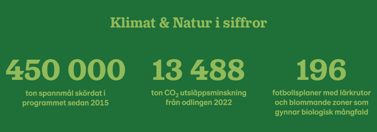 I Lantmännens odlingsprogram Klimat & Natur för Framtidens Jordbruk odlas spannmål efter kriterier för minskad klimatpåverkan och ökad biologisk mångfald. Med Klimat & Natur driver vi utvecklingen, möter marknadens efterfrågan på hållbart producerade livsmedel och skapar möjligheter för lantbrukare att minska klimat- och miljöpåverkan i odlingen. Produkterna från odlingsprogrammet har sedan 2015 minskat klimatavtrycket med upp till 30 procent* och odlingen omfattar vete, korn, råg och havre.