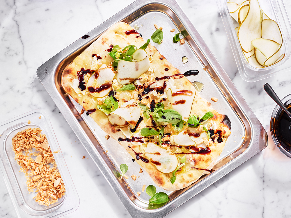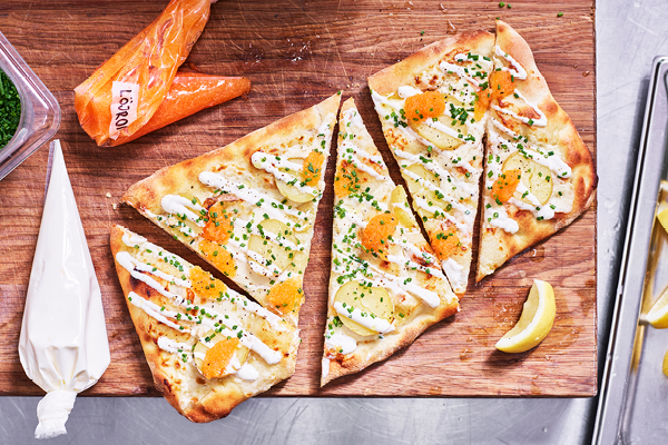 Att variera topping efter säsong är ett enkelt sätt att förnya och uppdatera menyn utan att det behöver vara komplicerat. Pinsa är lite “brödigare” än pizza och kan därför toppas med fler godsaker än en vanlig pizza. Alla toppings behöver inte heller gräddas i ugnen. Vissa kan läggas på efter gräddning för olika textur och en annan fräschör.