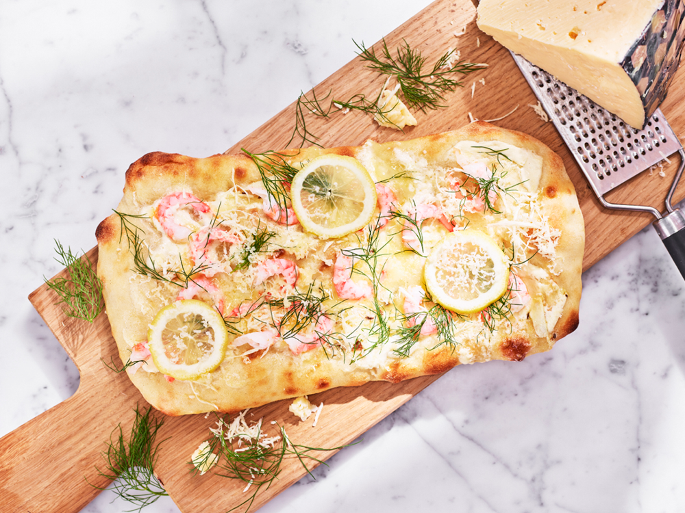 3. Toppa pinsan med räkor, riv över pepparrot och Präst. Lägg ut citronskivorna och avsluta med dillen.