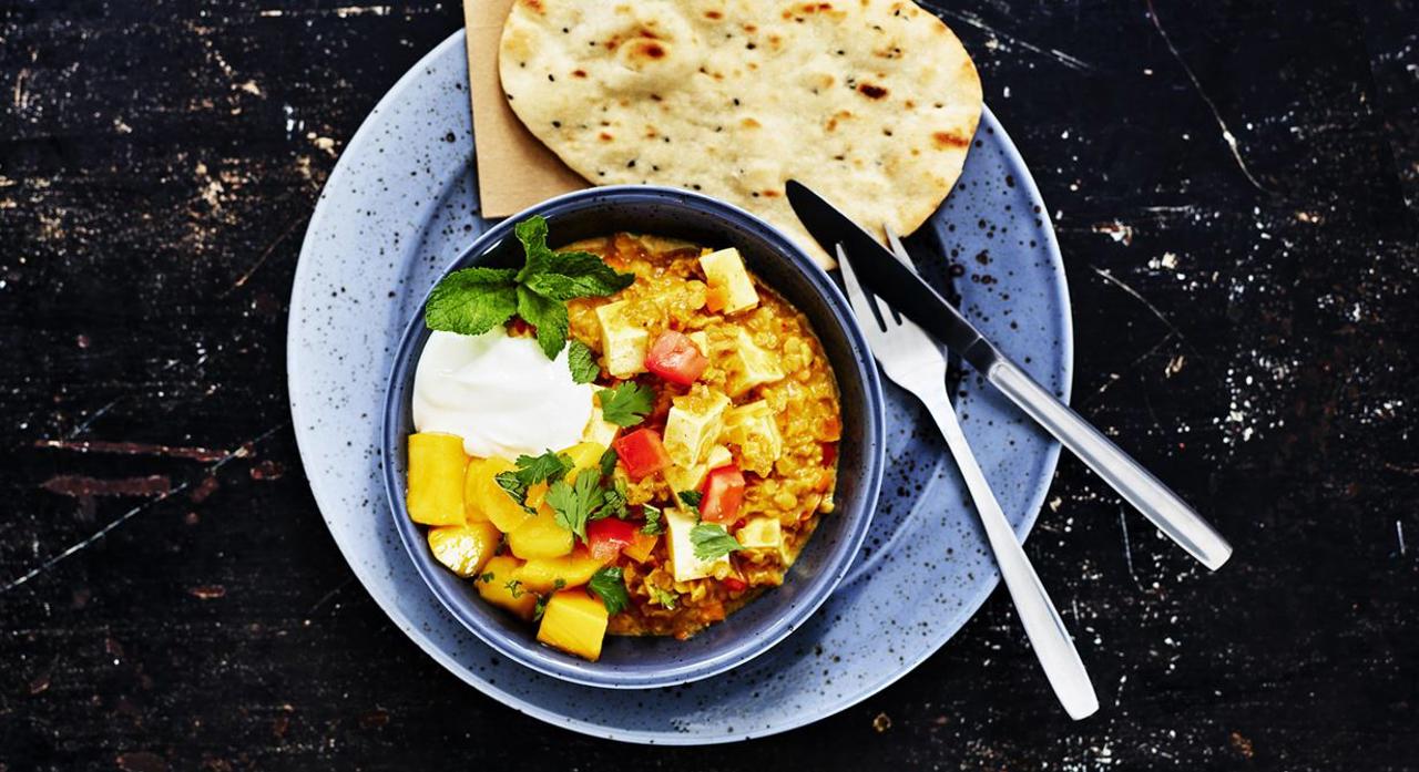 Daal med Grilling cheese och toppad med gräddfil, mango och tomat