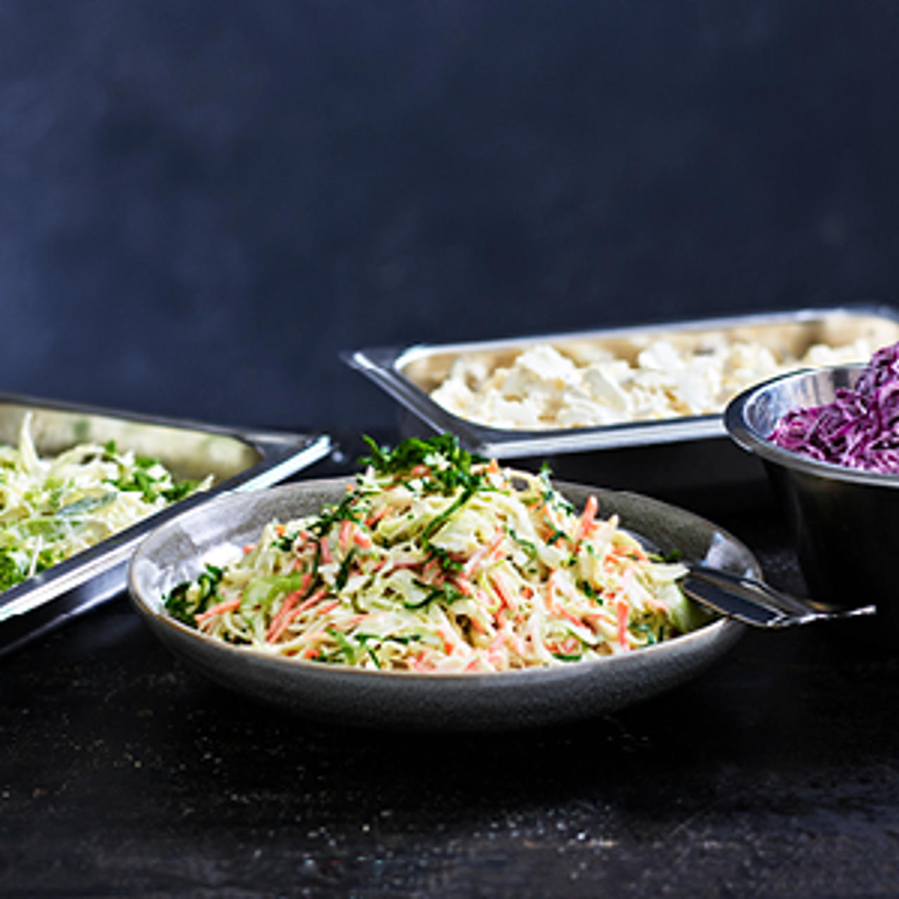 Schmand kompletterar majonnäs i coleslaw eller liknande sallader bra. Produkten tillför fräschör och håller sig dessutom stabil över tid. Variera coleslawn och blanda ner t ex hyvlad blomkål, rödkål, fänkål eller purjolök.