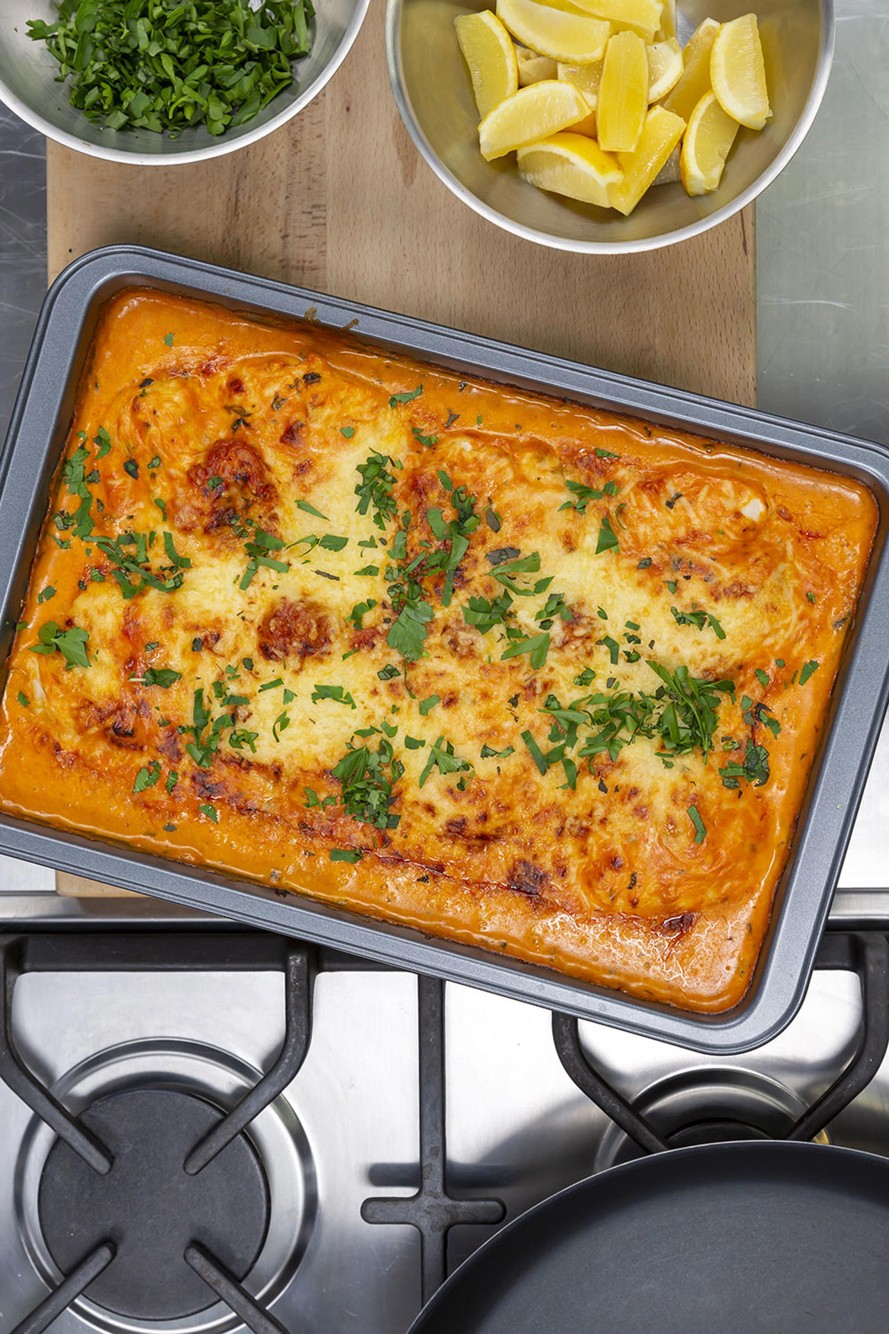 Krämig Fiskgratäng med färska örter och spenat.