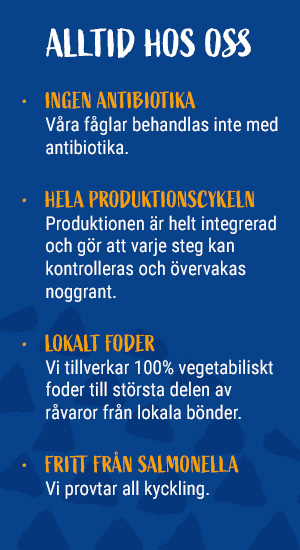 1) Utan antibiotika: Våra fåglar föds upp friska – helt utan rutinmässig användning av antibiotika.