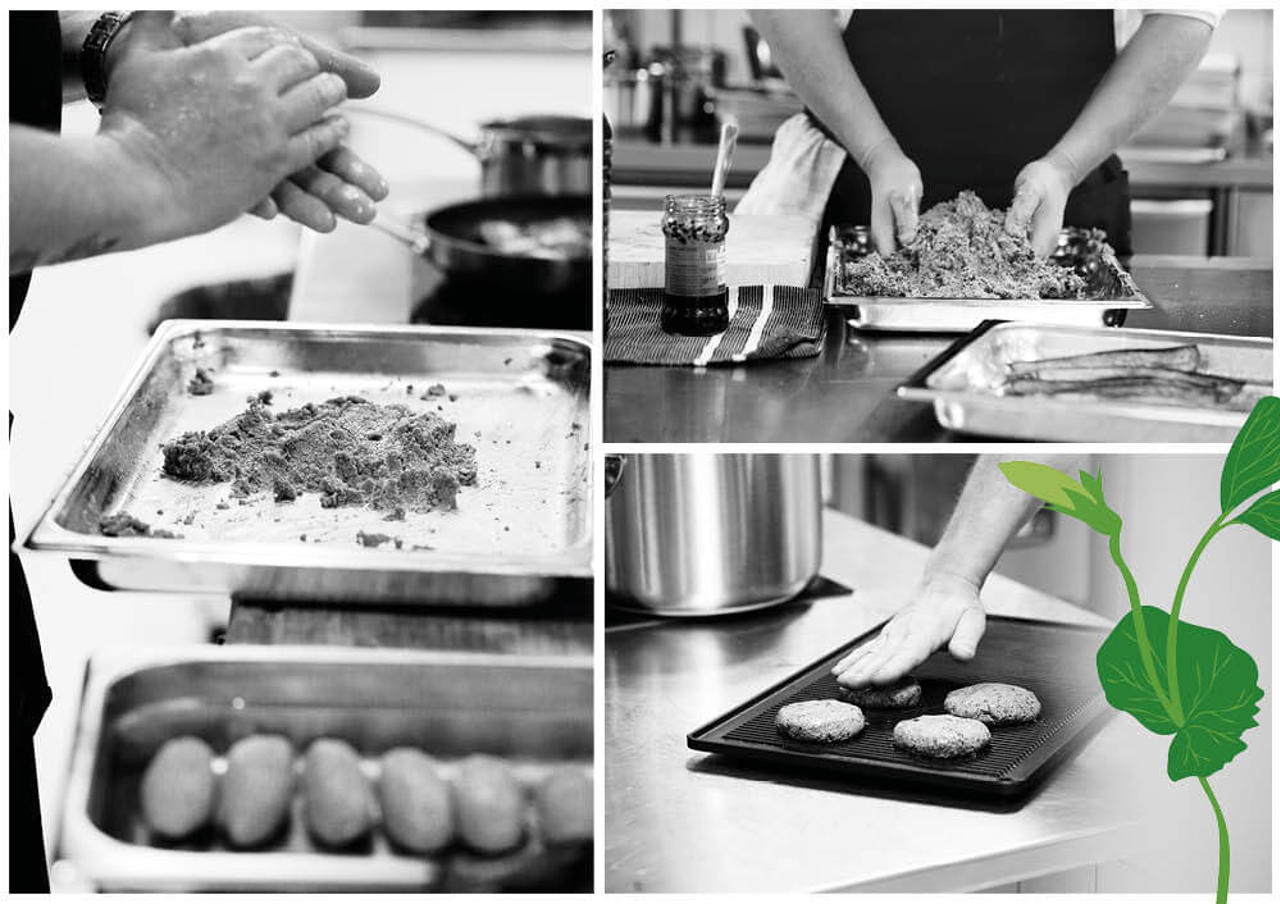 - Blanda Formbar Vegofärs Ärta med tacokrydda och forma till järpar och baka av i ugnen på 150°C kombi, tills en innertemp på 70°C.