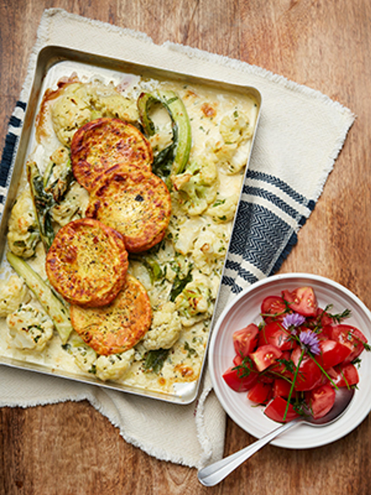 - Baka av i ugn på 180°C kombi 10% ånga ca 15–20 min eller tills att osten har fått lite färg och blomkålen mjuknat, men fortfarande har en hel del textur kvar.