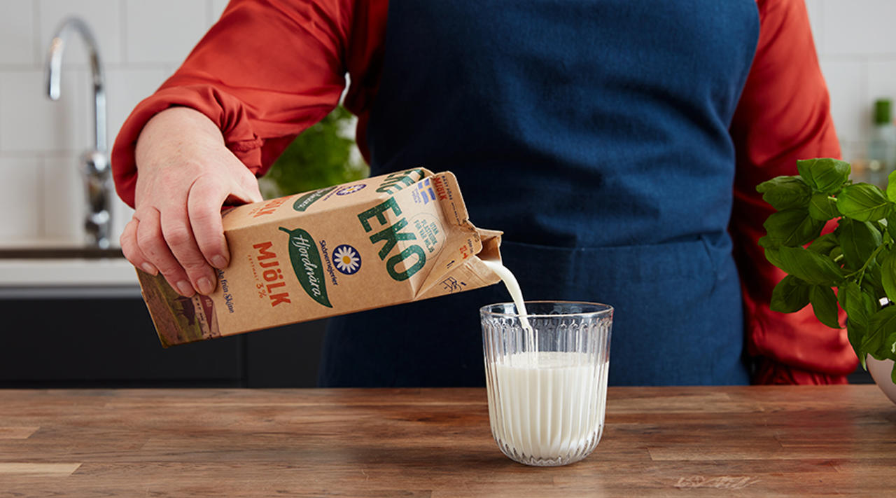 Hållbar utveckling är en central del av Skånemejeriers arbete och genomsyrar hela företagets verksamhet. Vi strävar bland annat efter att våra förpackningar ska ha en så liten miljöpåverkan som möjligt. Efter en konsumentundersökning där 79 procent röstade ja, tog vi bort skruvkorken på Hjordnära ekologisk mjölk, vilket betyder 32 ton mindre plast per år. Och genom att ta bort det yttre, vita plastlagret har vi minskat förpackningens koldioxidutsläpp med 40 procent.