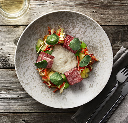 Oxbringa med semitorkade picklade rotsaker, gravat äpple, krasse- och senapsemulsion och skummig dijonvelouté