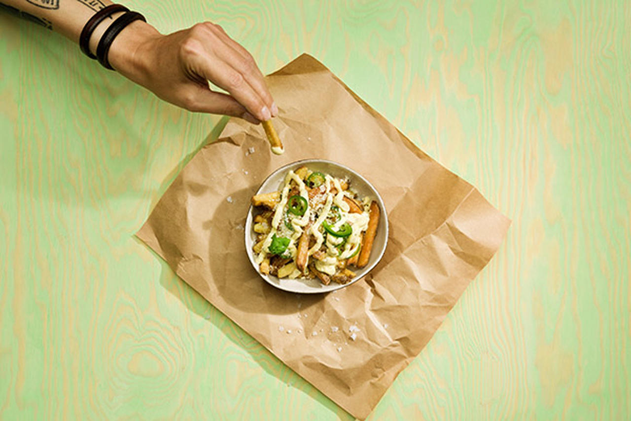 Ringla över Rydbergs Jalapeño Bearnaise över pommes, toppa med färsk hackad jalapeño, riven parmesan och färsk koriander.
