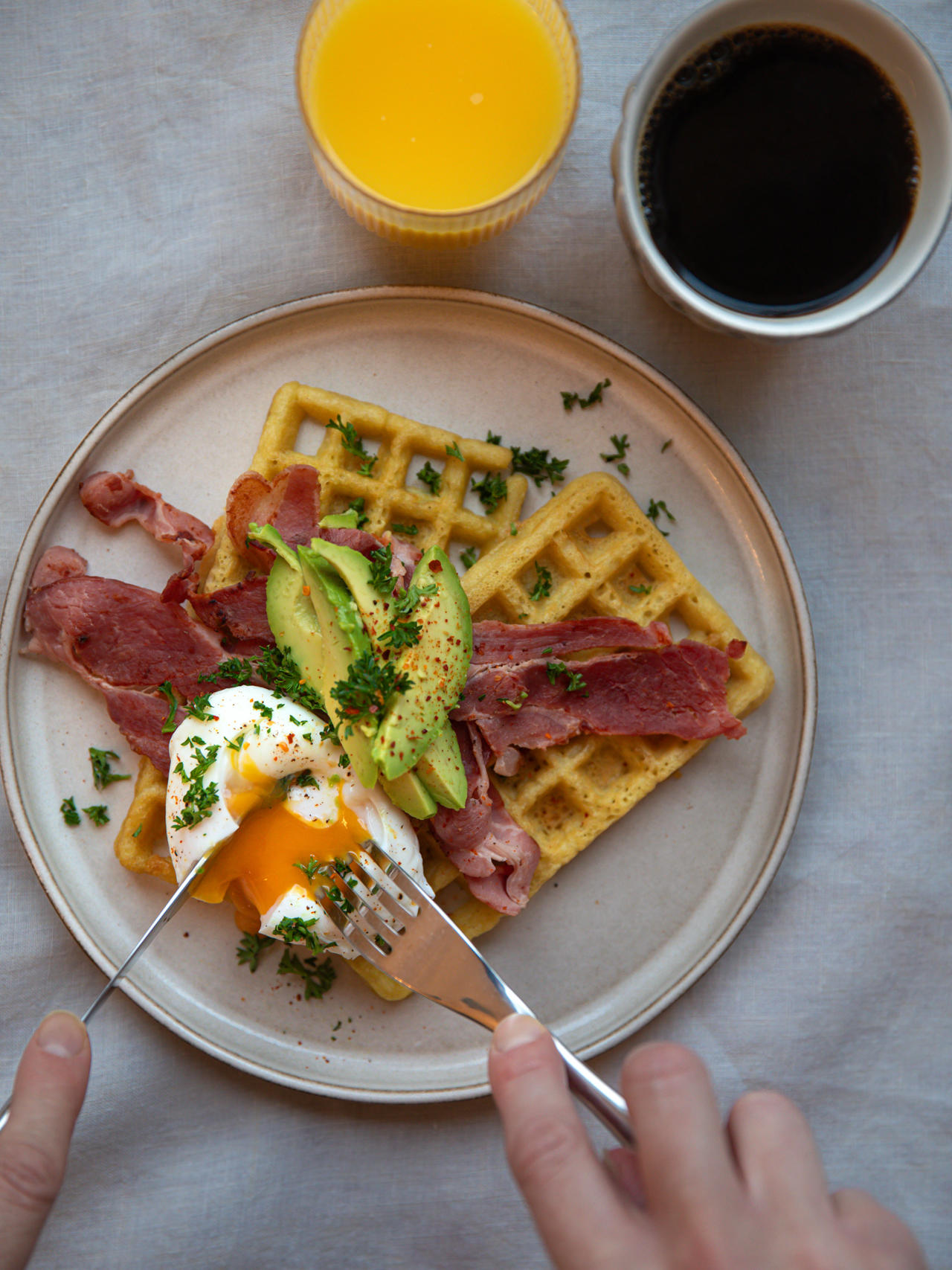 Frukostvåffla: Avokado, pocherat ägg och bacon