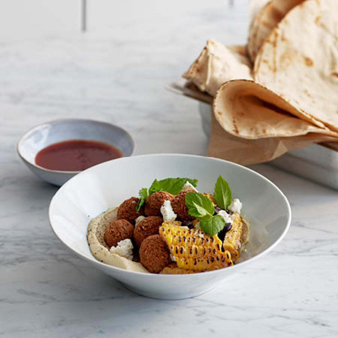En klassisk vegetarisk kikärtsrätt kryddad med bl.a. persilja, koriander och spiskummin som nog de flesta av oss ätit som en rulle eller i ett pitabröd. Våga prova andra serveringssätt ex med Taboulleh på Fyra skånska gryn men myntayoghurt eller med grillad spetskål, chili och gurka – dina gäster kommer garanterat tillbaka för mer falafel.