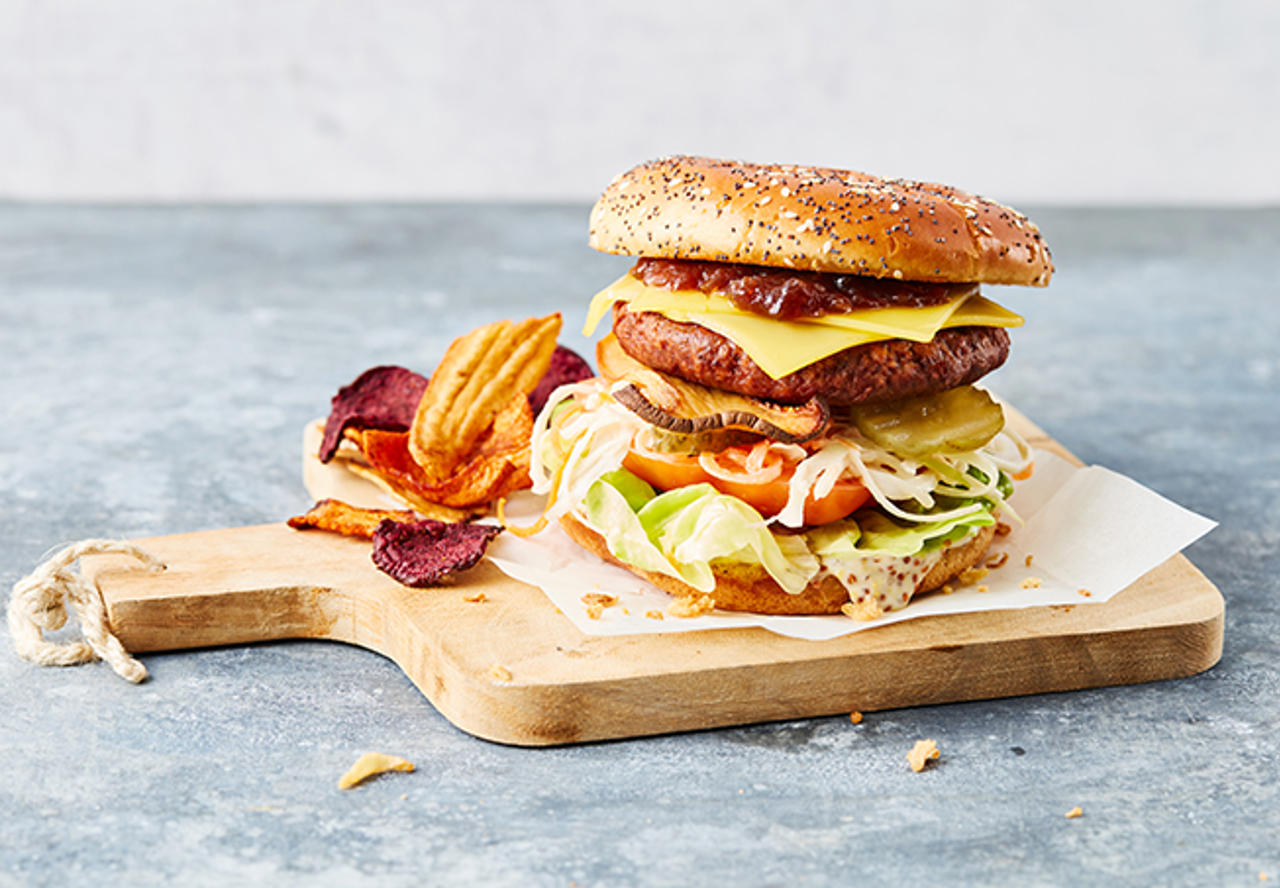 - Stek eller grilla burgarna, toppa med två skivor Violife Mature Cheddar Slices.