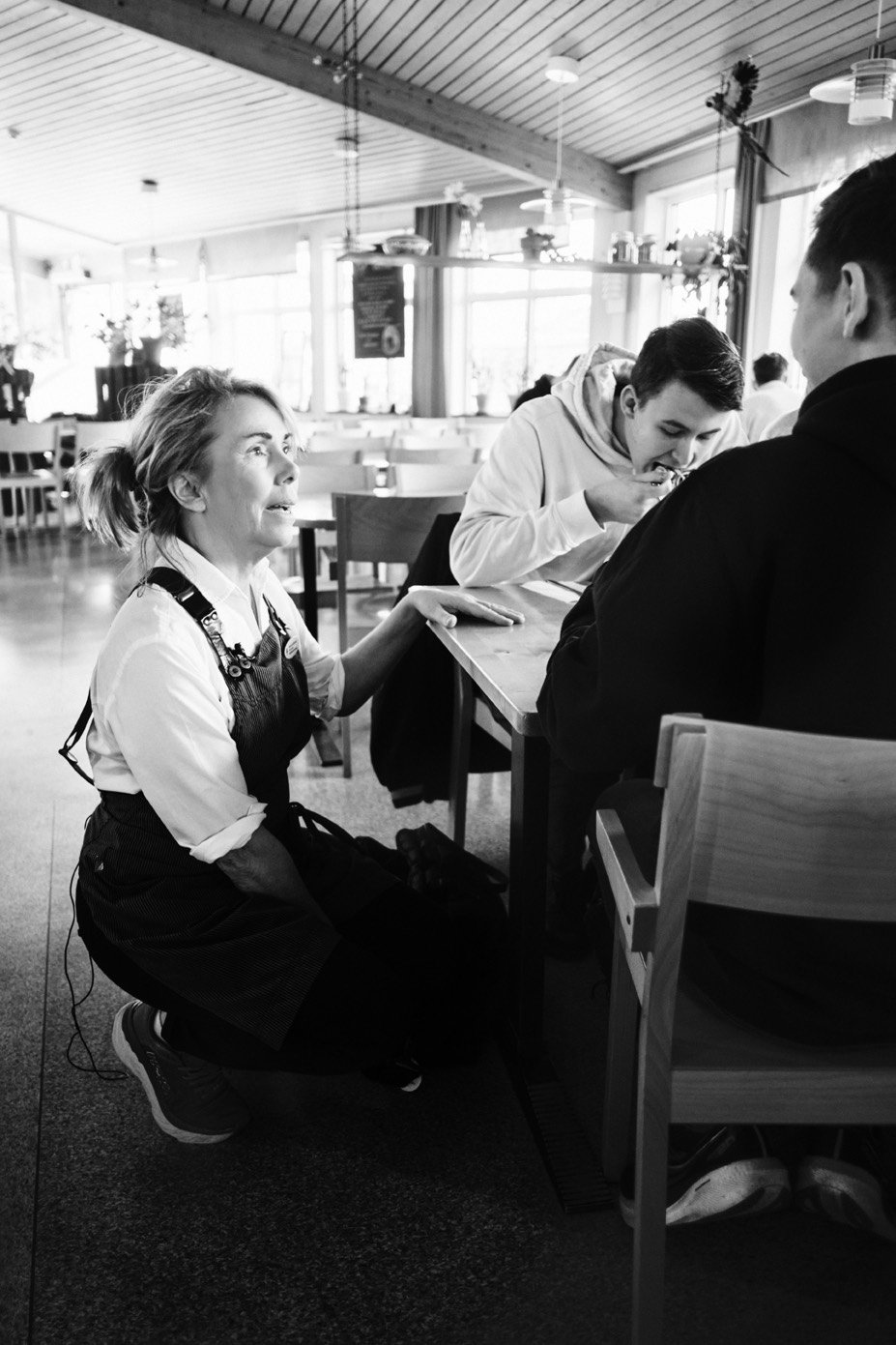 Lena och hennes kollegor arbetar dagligen ute i serveringen, torkar borden så att de är rena när gästerna ska äta och passar på att småprata med eleverna om vad de tycker om maten. Om det är något extra gott så åker det självklart upp på menyn igen. I köket står hållbarhet alltid i fokus och med ett ekologiskt sortiment på cirka 94 procent är mat på bra råvaror själva kärnan i verksamheten, trots att kostnader för råvaror per portion nu har ökat kraftigt.