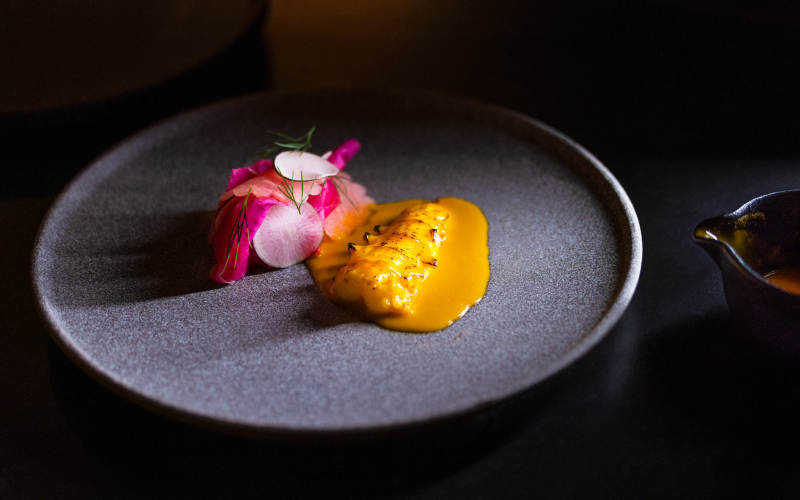 Med morot- och havtornsjuice, picklad rättika och kålrabbi.
