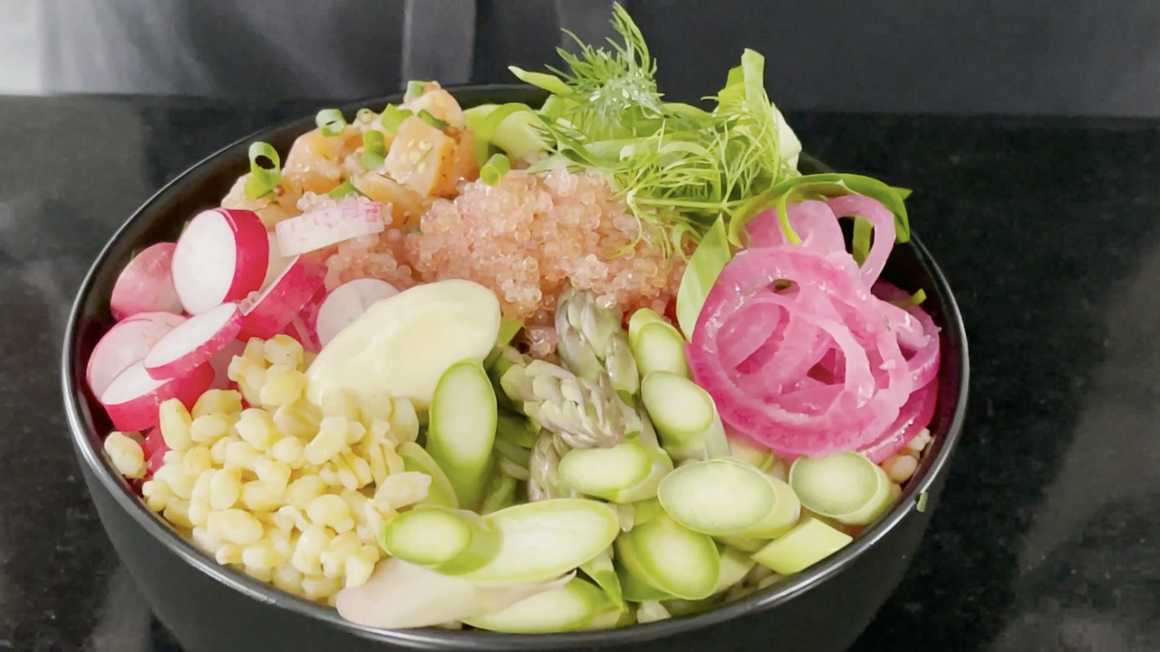 Poké bowl, är ursprungligen husmanskost från Hawaii, här i en Nordisk tolkning. "Poké" är en skål fylld med ris, rå fisk och grönt. I detta fall med gravad lax, durumvete, sparris, stenbitsrom, picklad rödlök, rädisor och en massa härliga kryddor!
