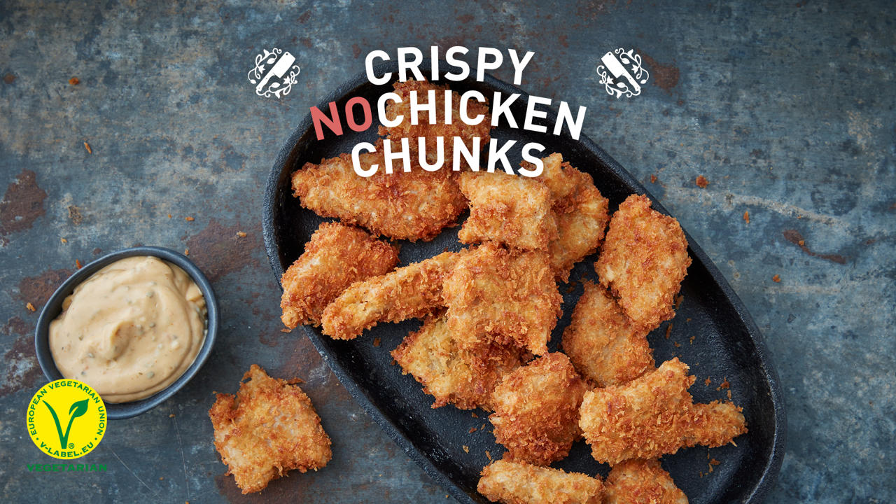 I vårt sortiment hittar du därför alltifrån rejäla burgare till gyllengula små nuggets och matiga NoChicken Chunks. Och apropå NoChicken Chunks – här får du fyra recept med just dessa. Crispy NoChicken Chunks, kryddig NoChicken Shawarma, alltid lika omtyckta NoChicken Tikka Masala och NoChicken Wrap.